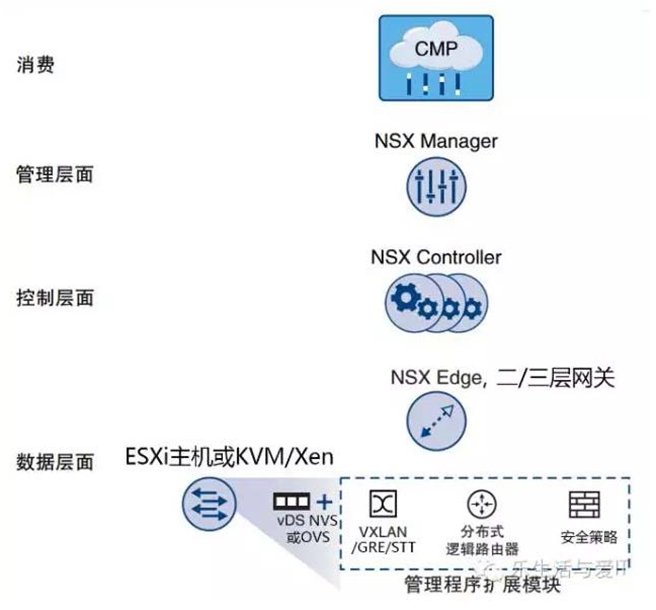 ??下圖是NSX網絡虛擬化架構的基本示意圖,它分為數據平面、控制平面(兩個平臺的分離,與提到的SDN架構完全吻合)、管理平面。其中數據平面中,又分分布式服務(包括邏