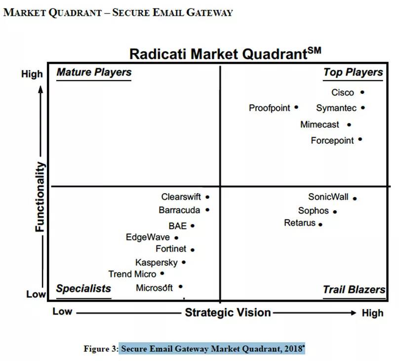 ??思科再次通過郵件安全產品強大的功能和戰略愿景在所有郵件安全供應商的評比中取得了最高總分。Radicati 將 SEG Market 定義為“在郵件服務器或 SMTP 網關級別部署的任何軟件,設備或基于云的服務,可以快速有效攔截來自郵件流量中的垃圾郵件、病毒、網絡釣魚/魚叉式網絡釣魚攻擊以及其他惡意軟件。報告里提到思科郵件安全產品既具有安全防護廣度和深度,也具有未來郵件安全發展的戰略愿景。