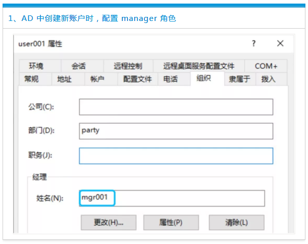 ??6、預(yù)先在 AD 域中創(chuàng)建信息中心管理員虛擬賬號(hào)作為部門領(lǐng)導(dǎo)的 Manager