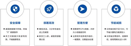深信服桌面云可實現桌面的快速部署及高效運維,大幅降低辦公桌面的運營成本,包括硬件更換成本、電費支出、人力資源投入等。