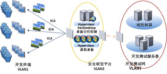 通過構建思杰桌面云,研發桌面、應用、數據被集中存放在高安全性的數據中心,敏感信息嚴禁流出數據中心,各種外設訪問得到統一管控,集中式的運維極大降低運維成本,外包人員的行為得到有效控制和審計。Citrix NetScaler設備將開發終端網段和安全研發平臺網段安全隔離,開發終端通過單一的入口訪問研發環境,開發終端和開發桌面之間的網絡通信得到嚴格管控。